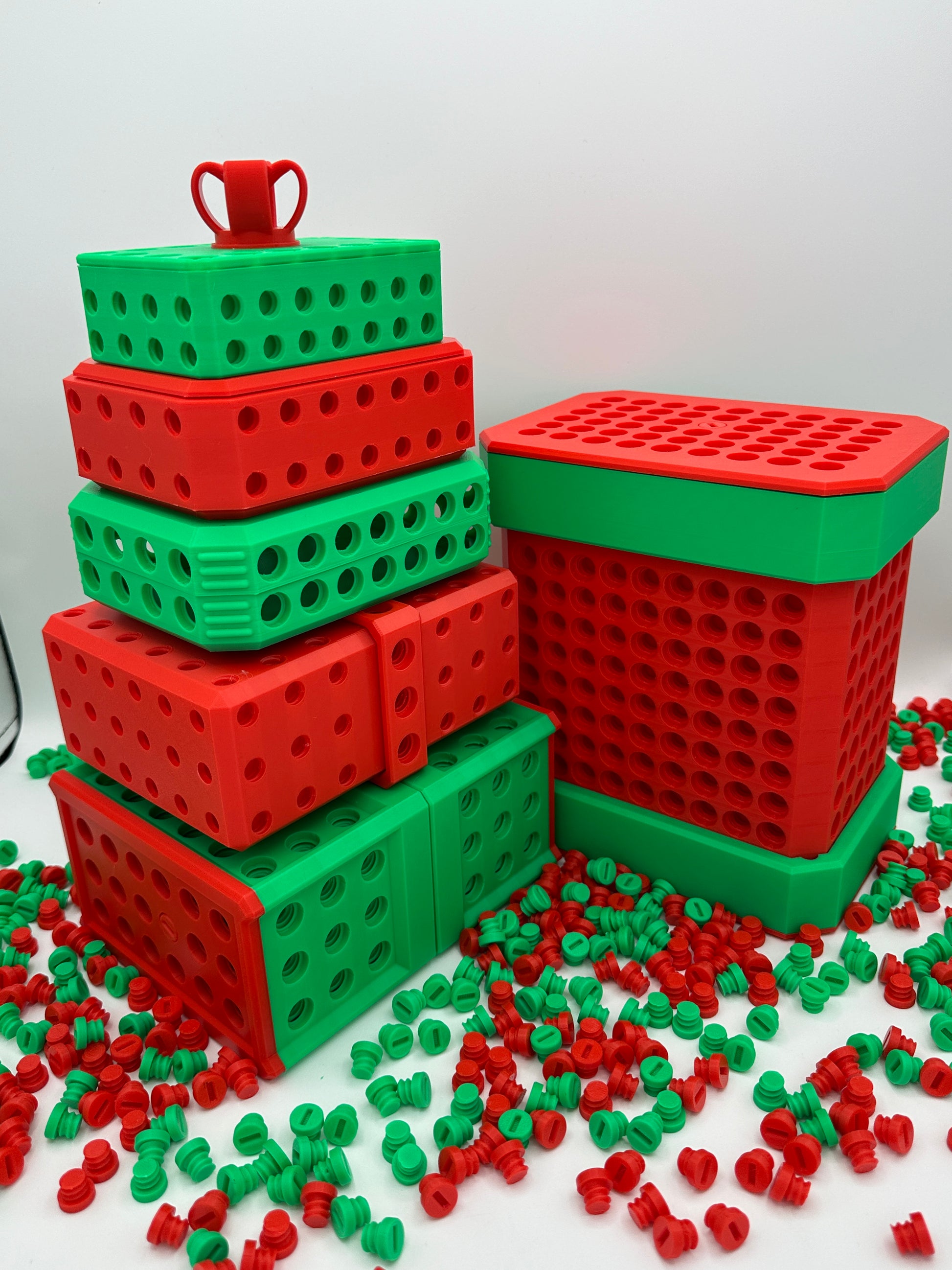 Gift box measures 8in. x 7in x 5in. It can be assembled in multiple combinations for different levels of aggravation. For larger gifts use just the outer layers while omitting the inner ones to have anywhere from 134 to 162 to 296 to 370 to 532 to the full 666 bolts!